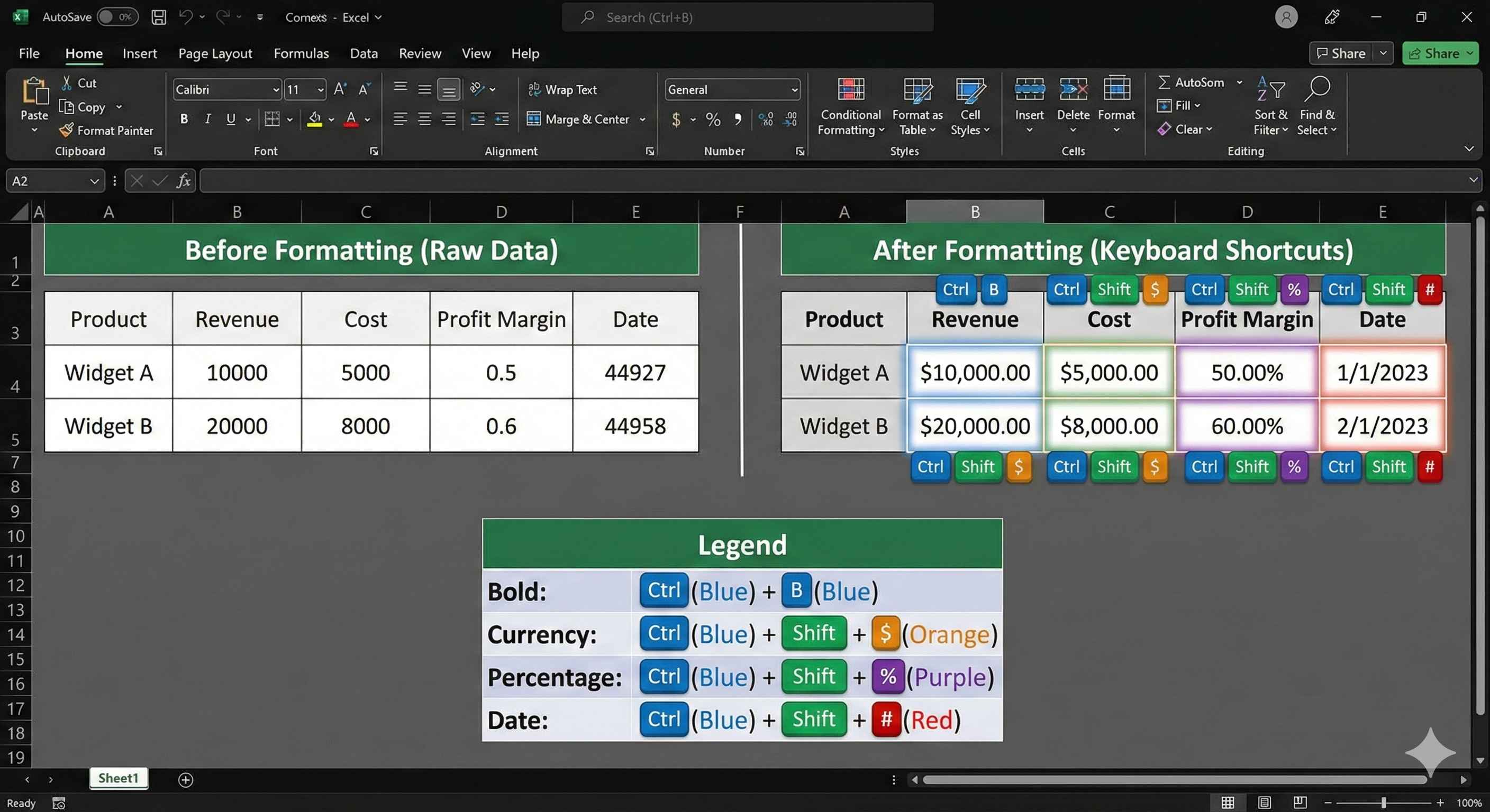 - Ctrl + Shift + ! - Number format (2 decimals)