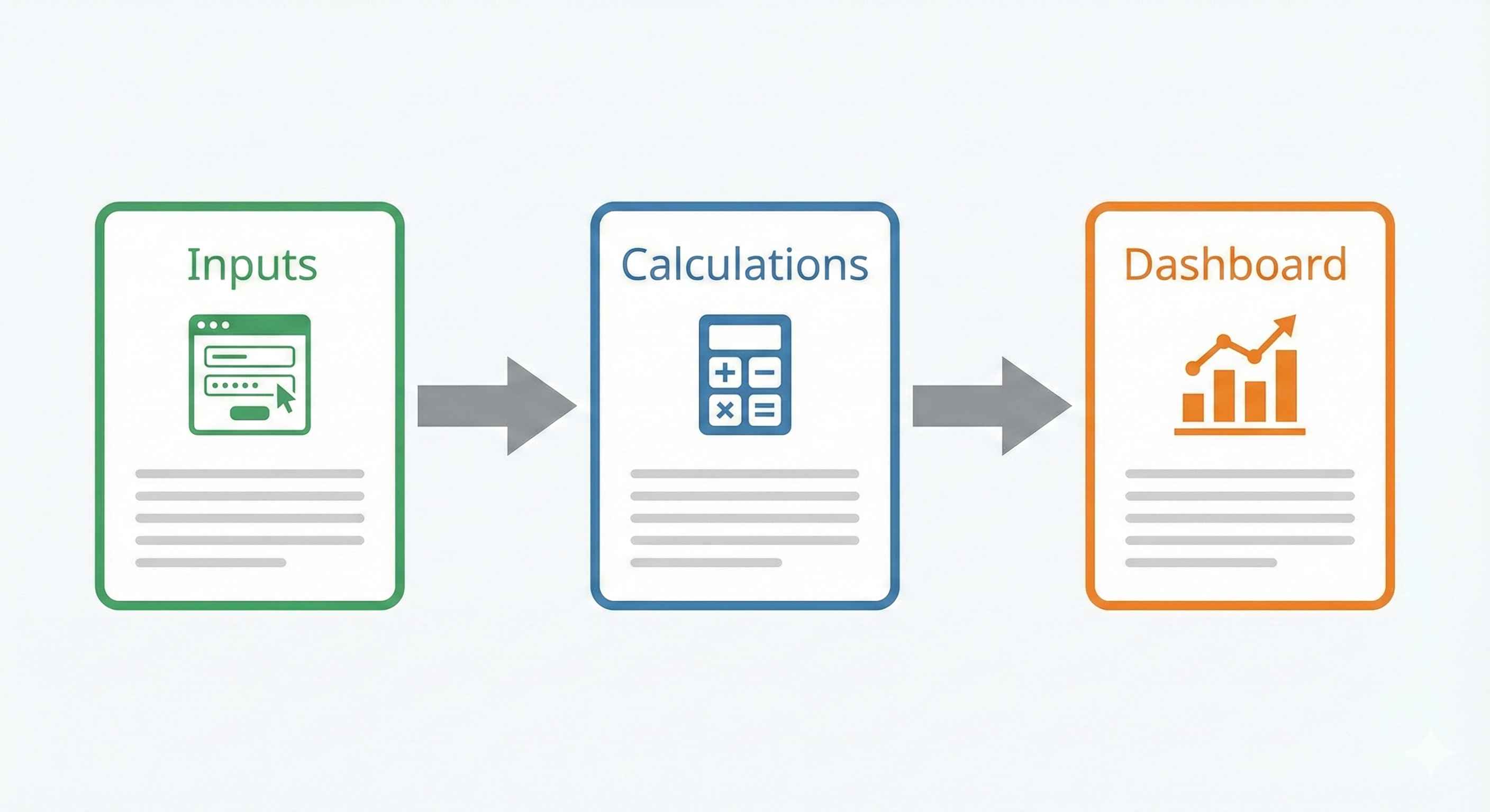 - Inputs - Where we enter assumptions (prices, costs, growth rates)