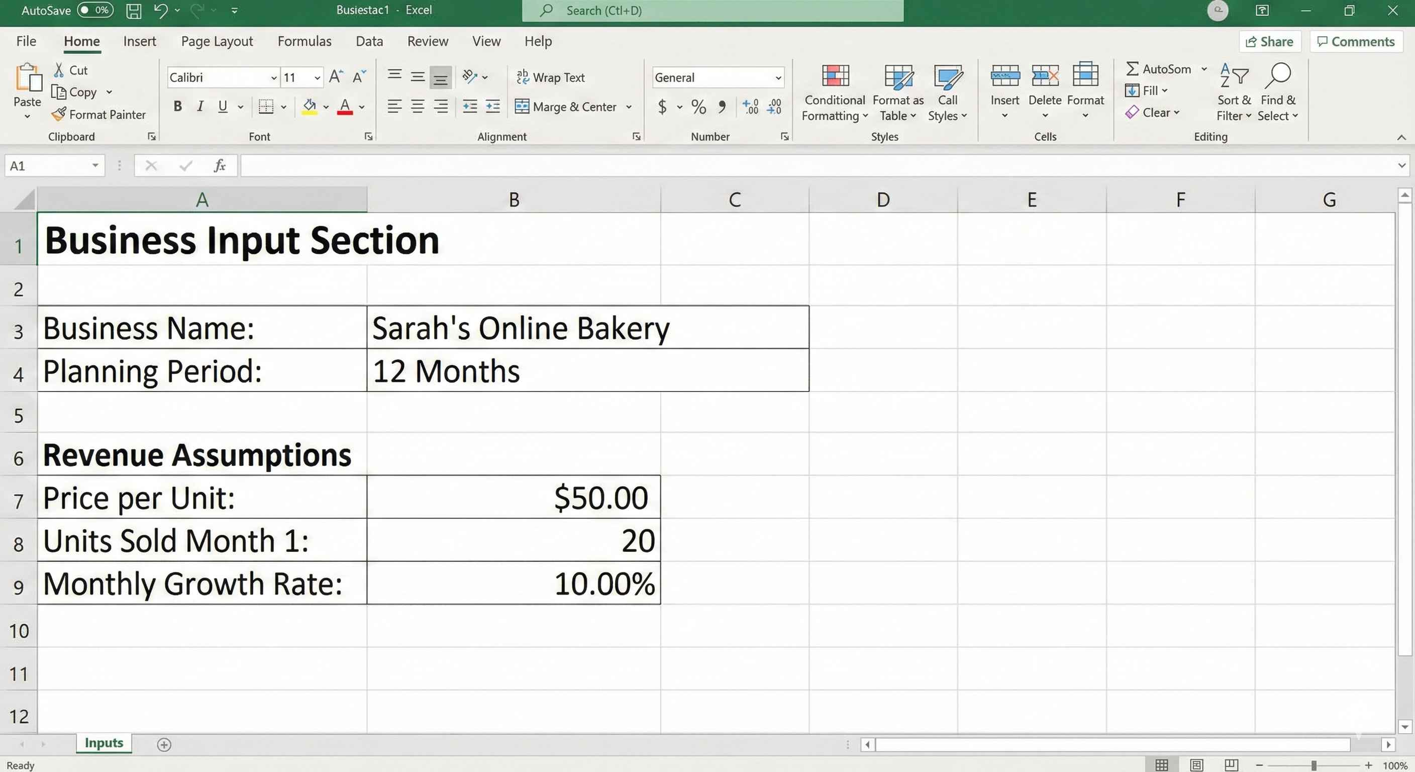 - In cell A1, type: FINANCIAL MODEL INPUTS