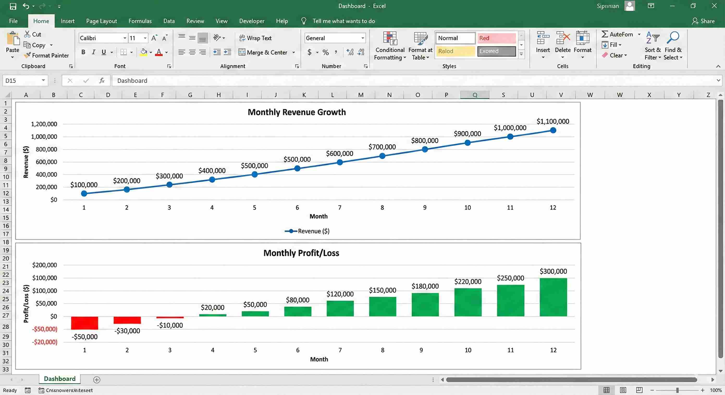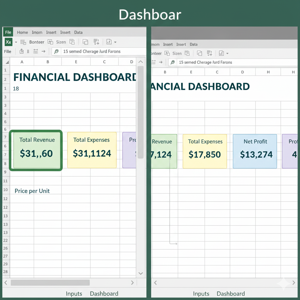 ā Inputs sheet has all assumptions clearly labeled ā Calculations sheet shows 12 months of projections ā Revenue grows according to growth rate ā All formulas reference Inputs sheet (not hardcoded numbers) ā Net Profit row shows red for losses, normal for profits ā Dashboard shows 4 KPI cards with correct totals ā Charts display and update when you change inputs ā Break-even analysis shows cumulative profit ā Formulas are protected but inputs remain editable ā File is saved with a clear name