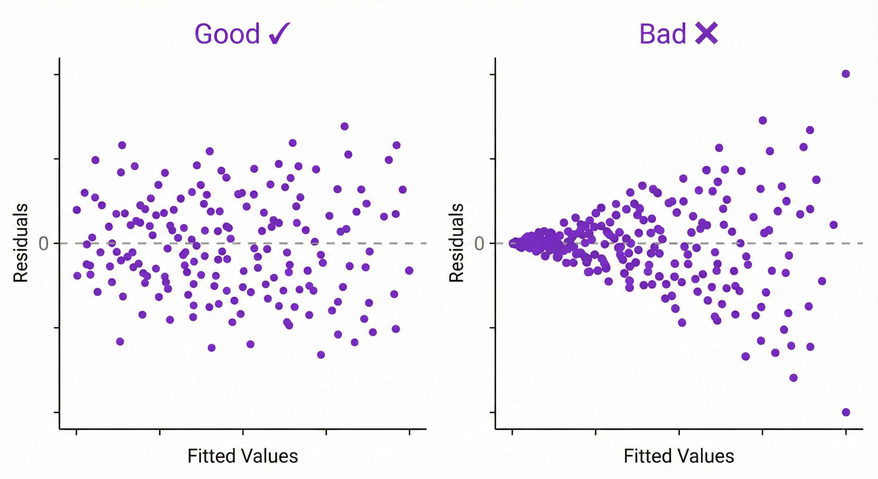 Good: Random scatter, even spread Bad: Funnel shape (spread increases)